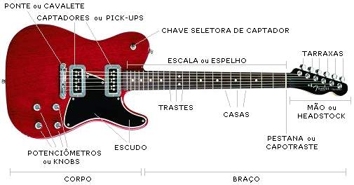 Corpo: A maior parte da guitarra. Em guitarras elétricas, ele abriga os componentes eletrônicos. Em violões acústicos, o corpo (com a boca) é responsável por amplificar o som naturalmente.