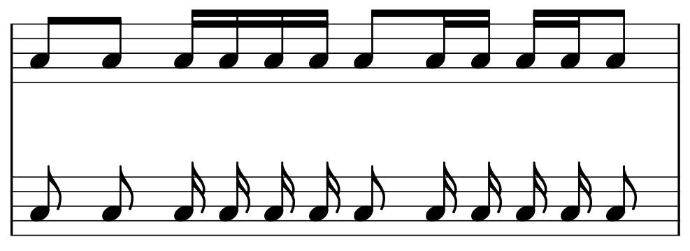 Para facilitar a leitura na partitura, as figuras musicais (como colcheias) podem ser agrupadas por traços; cada traço equivale a um colchete, tornando a visualização e compreensão do ritmo mais eficiente.